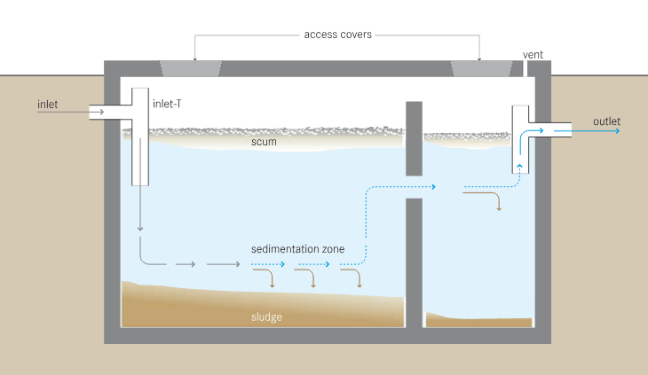 A septic tank is an underground system that collects and treats wastewater from a household. The tank is usually made of concrete, fiberglass, or plastic and is divided into two compartments. The first compartment receives the wastewater from the household, allowing solids to settle at the bottom while allowing liquids to rise to the top. Liquid passes through the tank, causing heavy particles to settle at the bottom and scum (mainly oil and grease) to rise to the top. Over time, the solids that accumulate at the bottom partially break down by bacteria without oxygen. However, accumulation happens faster than decomposition, so it’s necessary to regularly remove the built-up sludge and scum. The effluent from the septic tank can be dispersed through a soak pit or leach field, or transferred for further treatment using a solids-free sewer system. A properly designed and well-maintained septic tank typically removes around 50% of solids, 30-40% of BOD (biochemical oxygen demand), and reduces E.coli levels by one logarithmic unit; although efficiency varies based on operational practices, maintenance efforts, and local climate conditions.